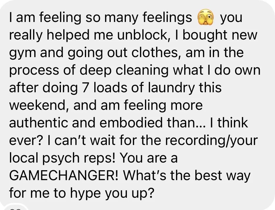 This is not a “manifest a specific person,” course, nor is it a “toxic love advice,” seminar filled with tactics to “win him back.” This deeply transformative mastermind will get to the heart of your relationship stories, beliefs, and patterns, develop your intuition, and build your relationship with God, so that one of two things happens: either you build a new relationship with the same person, or the right one comes in.